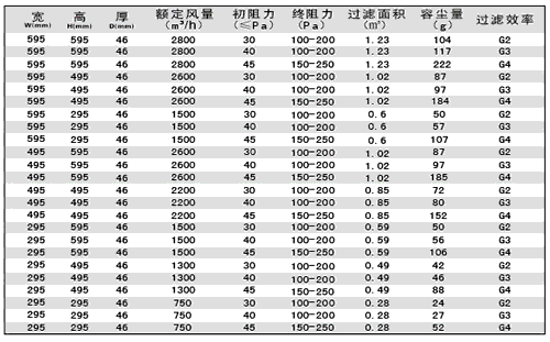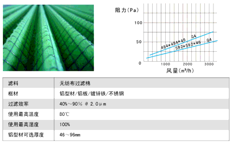 外框材质;铝型材/铝板折框/镀锌框/不锈钢框/纸框、滤料材质、合成纤维、护网材质、镀锌电焊网/铝网/不锈钢网过滤效率 G1:40%@2.0μm,G2:65%@2.0μm, G3:85%@2.0μm, G4:90%@2.0μm使用最高温度80℃,使用最高湿度100%。