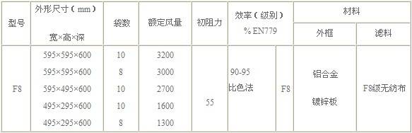 F8级袋式中效过滤器型号尺寸及其它参数:
