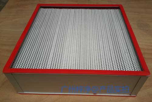 耐高温高效过滤器使用有隔板设计,波纹形隔板可以精确地保持褶层间距,在最小阻力下,最大限度地利用滤料,过滤器滤材两面180褶翻褶形褶层,滤料折弯时有两道压痕,使其在隔板的尾端开成锲形盒式褶层,锲形盒式褶层可以防止滤料破损。
